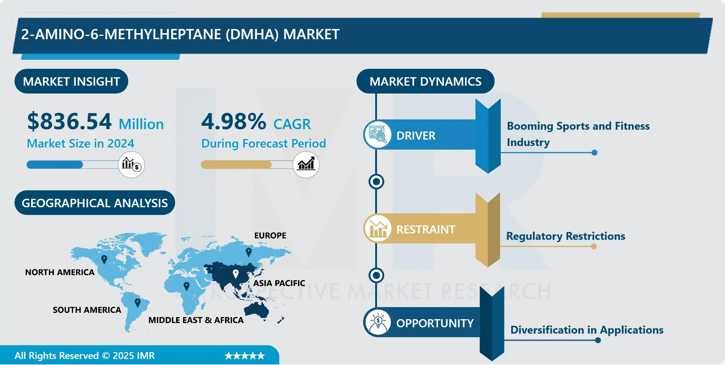"According to a new report published by Introspective Market Research , the 2-Amino-6-Methylheptane (DMHA) Market by Form, Application, and Distribution Channel, the Global 2-Amino-6-Methylheptane (DMHA) Market Size Was Valued at USD 836.54 Million in 2024 and is Projected to Reach USD 1,427.77 Million by 2035, Growing at a CAGR of 4.98% from 2025 to 2035.”